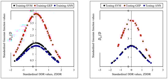 In addition, Figure 9 illustrates the graphical comparison of the performance of MLMs with respect to the distribution of the DDR index. Two attributes of this curve highlight superior model performance: (i) a narrower distribution curve and (ii) the maximum value on the vertical axis. These curves are presented for both the training and testing stages, allowing for a comprehensive assessment of model performance.