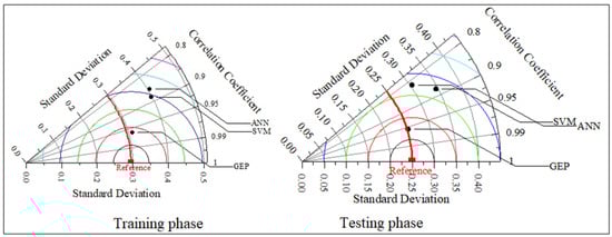 The Taylor diagram developed for the training and testing phases is given in Figure 10. The figure illustrates the superiority of the GEP model based on the features of the aforementioned diagram.