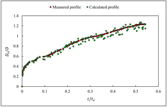 However, as the scour hole progressively widens and deepens toward equilibrium conditions (), a discernible divergence emerges between the predicted and observed profiles. This growing disparity is attributed to the escalating complexity of sediment–fluid interactions, including intensified turbulence and chaotic secondary flow structures that challenge precise simulation.