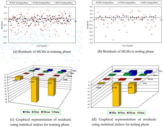 In addition, Figure 13c,d provide qualitative comparisons of the residual properties for the three models during both the training and testing phases. This figure clearly highlights the substantial differences in accuracy among the outputs of the GEP, SVM, and ANN models.