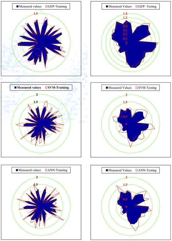 Figure 14 employs a radar plot to visually compare the alignment of predicted versus observed relative scour depths across the SVM, GEP, and ANN models during both training and testing phases. The GEP model consistently exhibits the closest alignment to the center of the plot (representing perfect agreement with observed values) across all scour depth ranges, confirming its superior accuracy as quantified by performance metrics (e.g., testing RMSE , ).