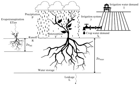 Water balance components of the bucket model: precipitation P, interception T, runoff R, evapotranspiration , crop water demand , and leakage L. , , y stand for initial root depth, maximum root depth, and irrigation system, respectively.