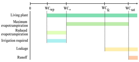 Ranges of possible water content (WC) values for different processes. Note that the light-blue bar of irrigation requirements shows the case of irrigation up to the critical level ().