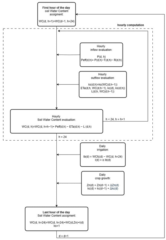 WaterCROPv2 is designed so that the continuous description of the water balance (Equation (1)) in time t is discretized in hours that, every day, run from h = 1 to h = 24. This discretization implies that , L, and P, which naturally occur during or throughout the whole day, are discretized hourly. Every day, at the first hour ( of the day d), the bucket stores the same volume of water as the last hour of the previous day ( of day ) plus , computed as the amount of water needed to reach the chosen water content, i.e., .
