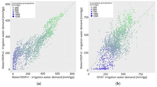 Scatterplots comparing, cell by cell, the irrigation water demand of maize in 2010 in Italy computed by (a) WaterCROPv2 and WaterCROPv1 and (b) WaterCROPv2 and ISTAT database. The black line corresponds to the bisector. The color of the dots varies gradually from green (scarce precipitation) to blue (abundant precipitation) according to the values of cumulative precipitation over the growing season in the cell.