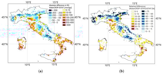 (a) Absolute and (b) relative differences in irrigation water demand of maize in 2010 computed by WaterCROPv2 and ISTAT.