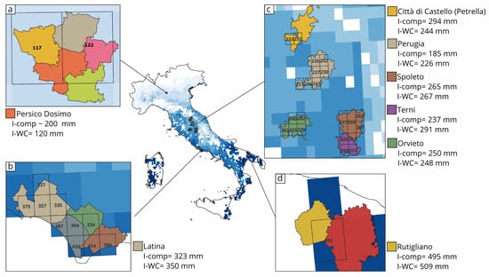 Comparisons between irrigation requirements estimated at the national scale with WaterCROPv2 () and irrigation requirements evaluated in previous studies at field or local scale (): (a) Po Plain (Persico Domico) [], (b) Pontina Plain [], (c) Umbria region [], (d) Puglia region (Rutigliano) [].