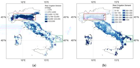 Map of modeled mean irrigation demand by maize in Italy expressed in (a) cubic meters; (b) millimeters. The red rectangle spotlights the Pianura Padana region, while the green one encloses the Salentino region.