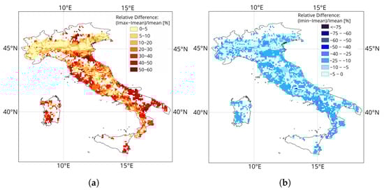 Relative difference in modeled (a) maximum and (b) minimum irrigation water demand with respect to the mean irrigation requirement.