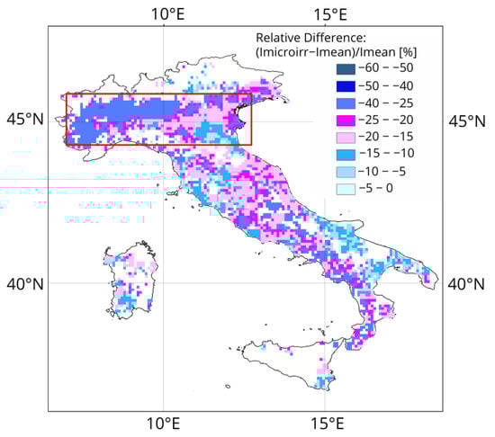 A key use of agro-hydrological models, such as WaterCROPv2, is to evaluate irrigation water demand. However, even though they are generally used as assessment tools, they can also be applied as modeling tools. In this sense, they are key instruments to analyze scenarios and propose alternatives to the current state. For instance, it is possible to analyze the effect of changing irrigation thresholds (e.g., irrigation up to fractions of field capacity) or timing (e.g., biweekly or weekly) to study the impact of different irrigation systems and to investigate the effects of climate change. These scenarios are fundamental to make the right decisions on the management and planning of water resources. As an example, we report here (Figure 10) the hypothetical scenario where maize is irrigated solely by micro-irrigation. It can be useful for critical analysis, localization, and quantitative evaluation of the water savings of potential investments in new micro-irrigation systems. Figure 10 shows that, at the national level, the mean water saving is 21%, and in 75% of the cells it goes up up to 28% (59 mm/lgp). In some areas, it can have even larger effects: it is evident how the strongest potential water-use reduction of 30–40% is mostly located close to the Alps and the southern Apennines, where flow irrigation is now predominant due to the abundance of water (Figure A1b, Appendix A). This information becomes particularly valuable when considering future temperature and precipitation projections. Studies on climate change impacts foresee in the areas close to the mountains an increase in mean temperature of 4 °C and a shift in precipitation distribution towards winter, causing an increase in drought spells in summer []. Thus, the increased evapotranspirative water demand caused by the higher temperatures will find even less support in the precipitation water, increasing the stress on the irrigation water.