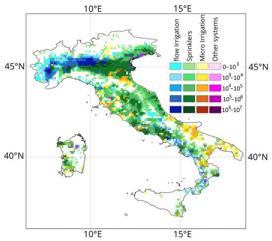 Classification of according to irrigation system (flow irrigation in blue, sprinklers in green, and micro-irrigation in yellow) and volumetry class (reported to the right of the color legend in m3).