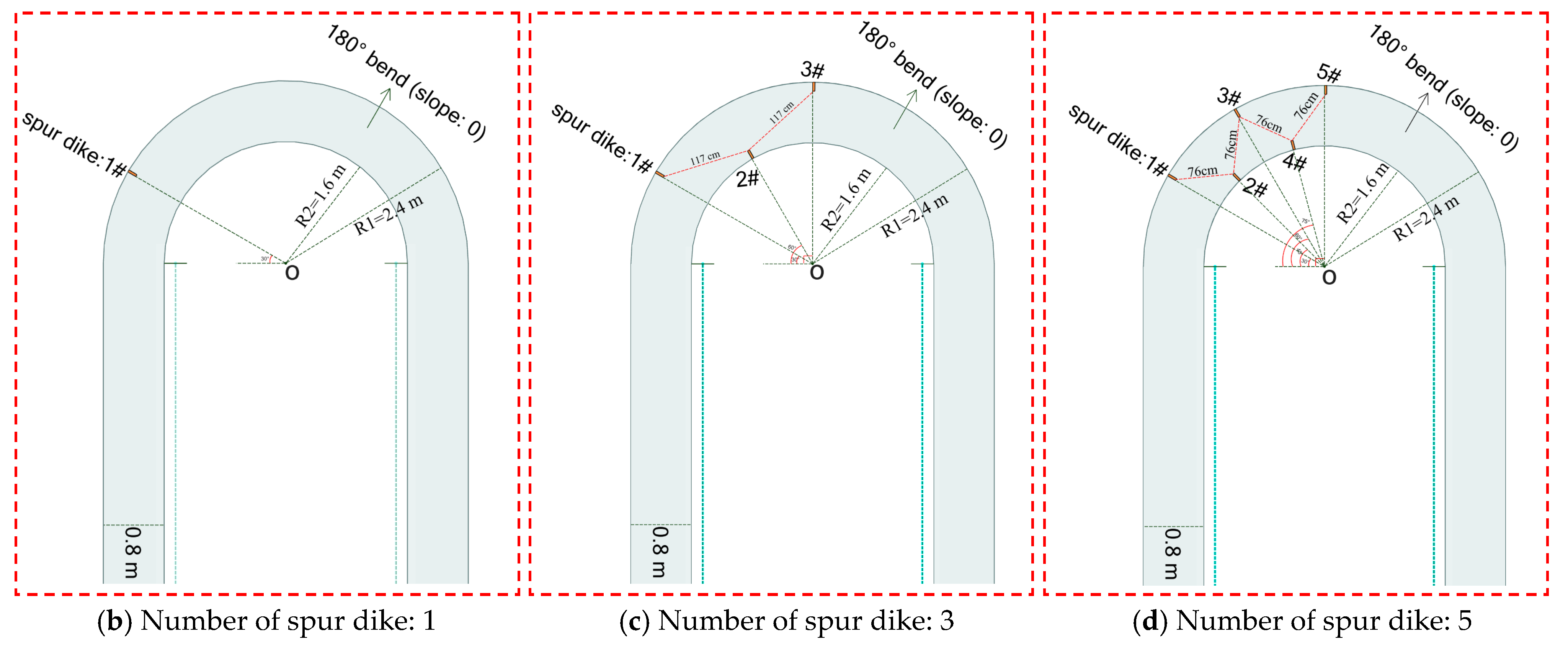 | Geometry and layout | Most studies have focused on spur dike groups along a single bank or on simple aligned/staggered configurations across both banks, primarily for channel regulation or bank protection [28,29]. | Research has predominantly focused on scour protection using single, double, or arrays of spur dikes along the concave bank. In contrast, configurations on the convex bank or systematic alternating arrangements between both banks have received substantially less attention. [30,31] | The current work employs an alternating layout of spur dikes on both banks, departing from the traditional single-bank pattern. |