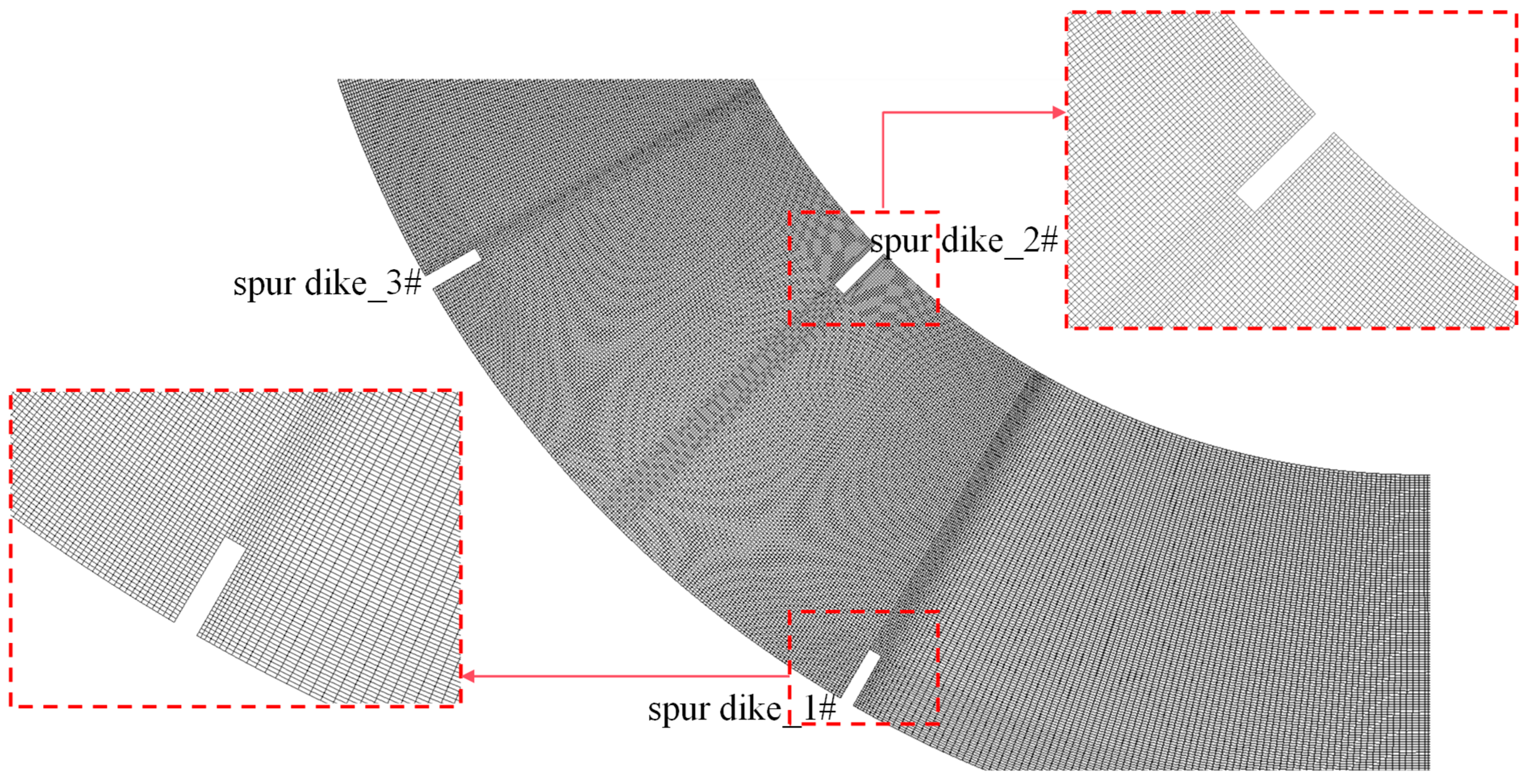 - Fan, X.J.; Li, Z.; Pang, C.C. Research on the Effect of Hook-angle and Length on the Structure of Water Flow around Permeable Spur Dike. Adv. Eng. Sci. 2025, 1–16. Available online: https://link.cnki.net/urlid/51.1773.TB.20250628.1553.004 (accessed on 1 December 2025).