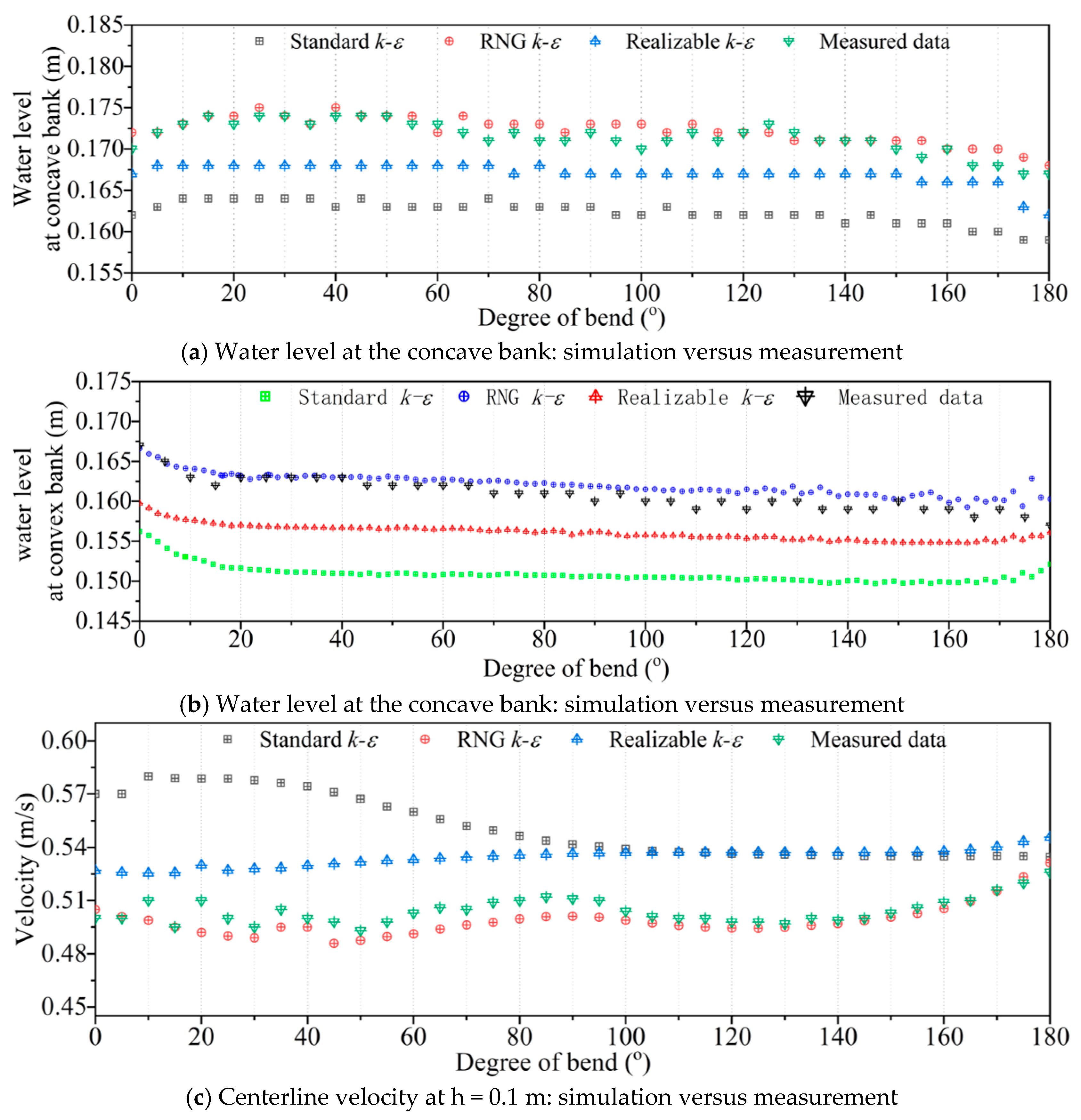 | Realizable k-ε model | Water level of concave bank | 0.0044 | 0.0045 |