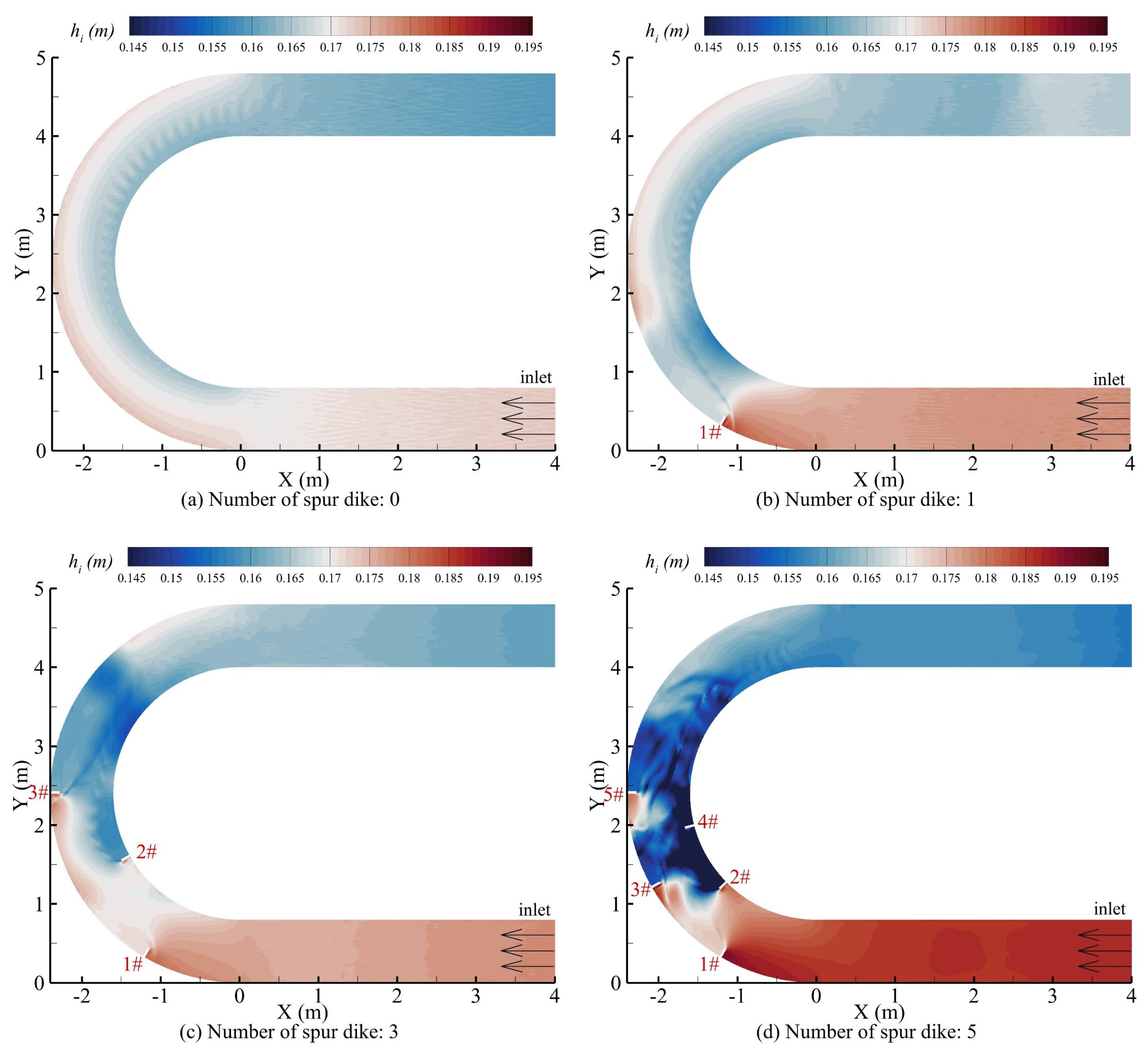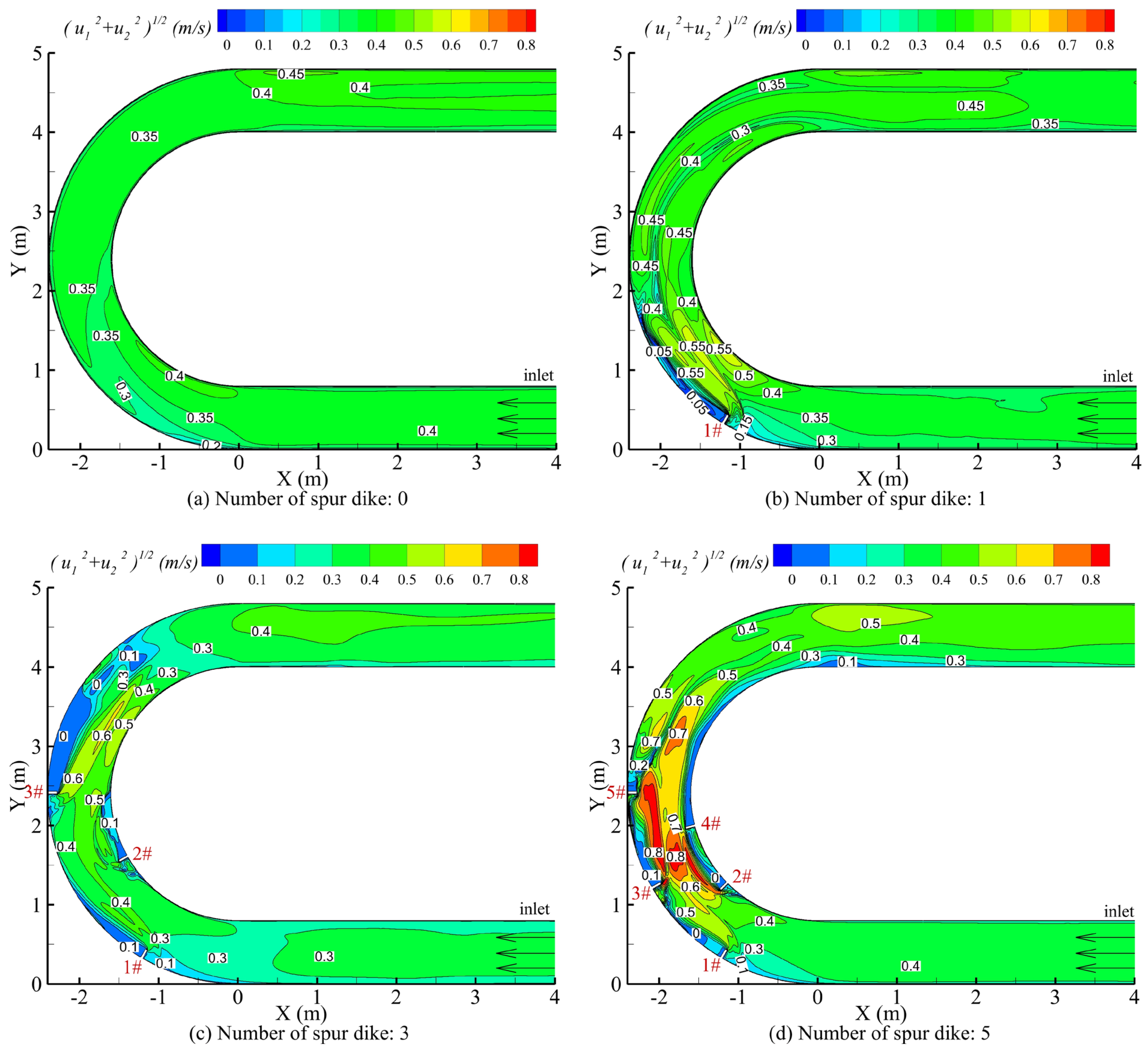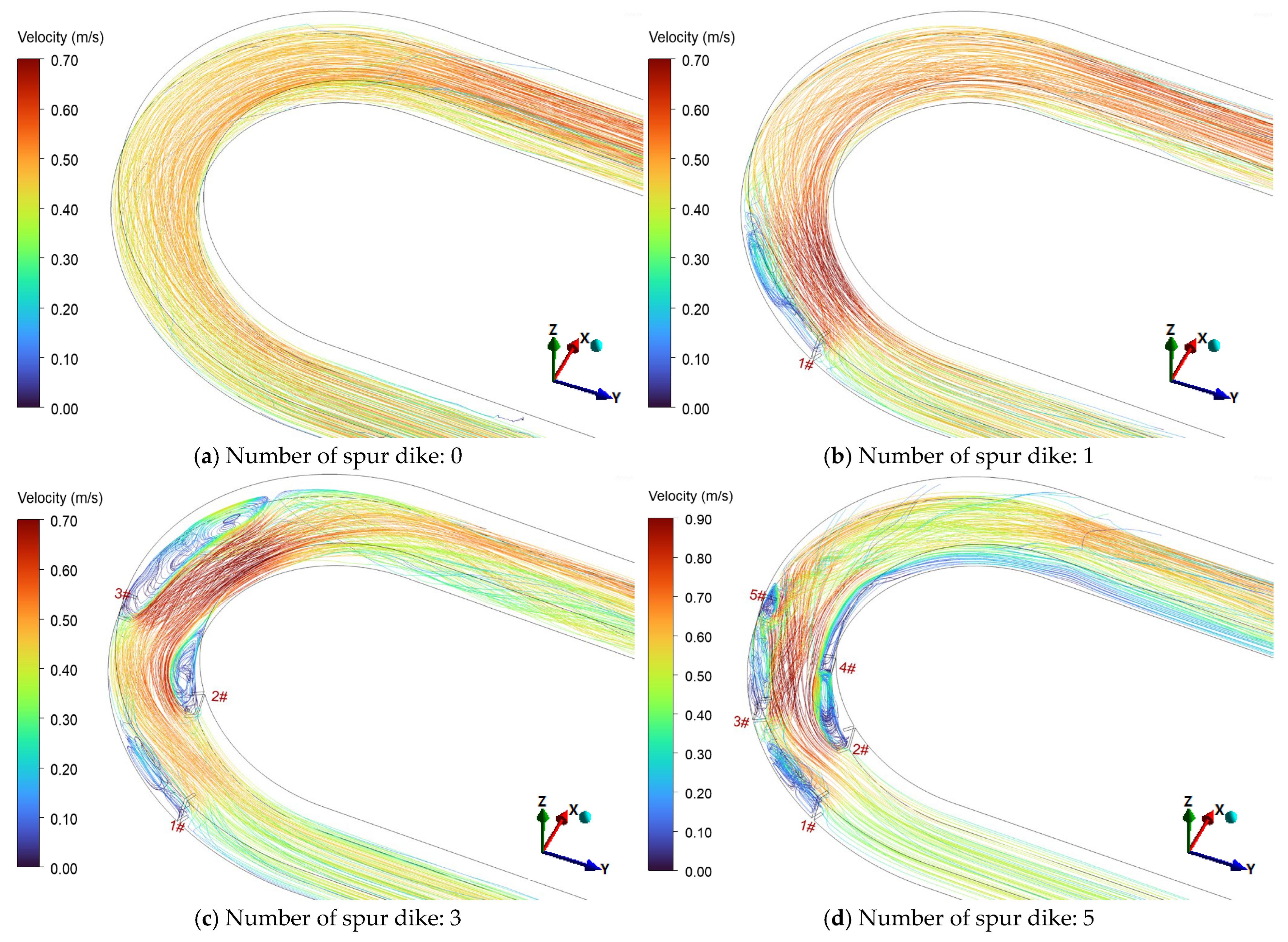 - Zhang, Y.; Wu, Y.P.; Cui, P.Y. Numerical simulation for the effect of spur dike lengths on the hydraulic characteristics of the bend. J. Water Resour. Water Eng. 2019, 30, 164–170. [Google Scholar]