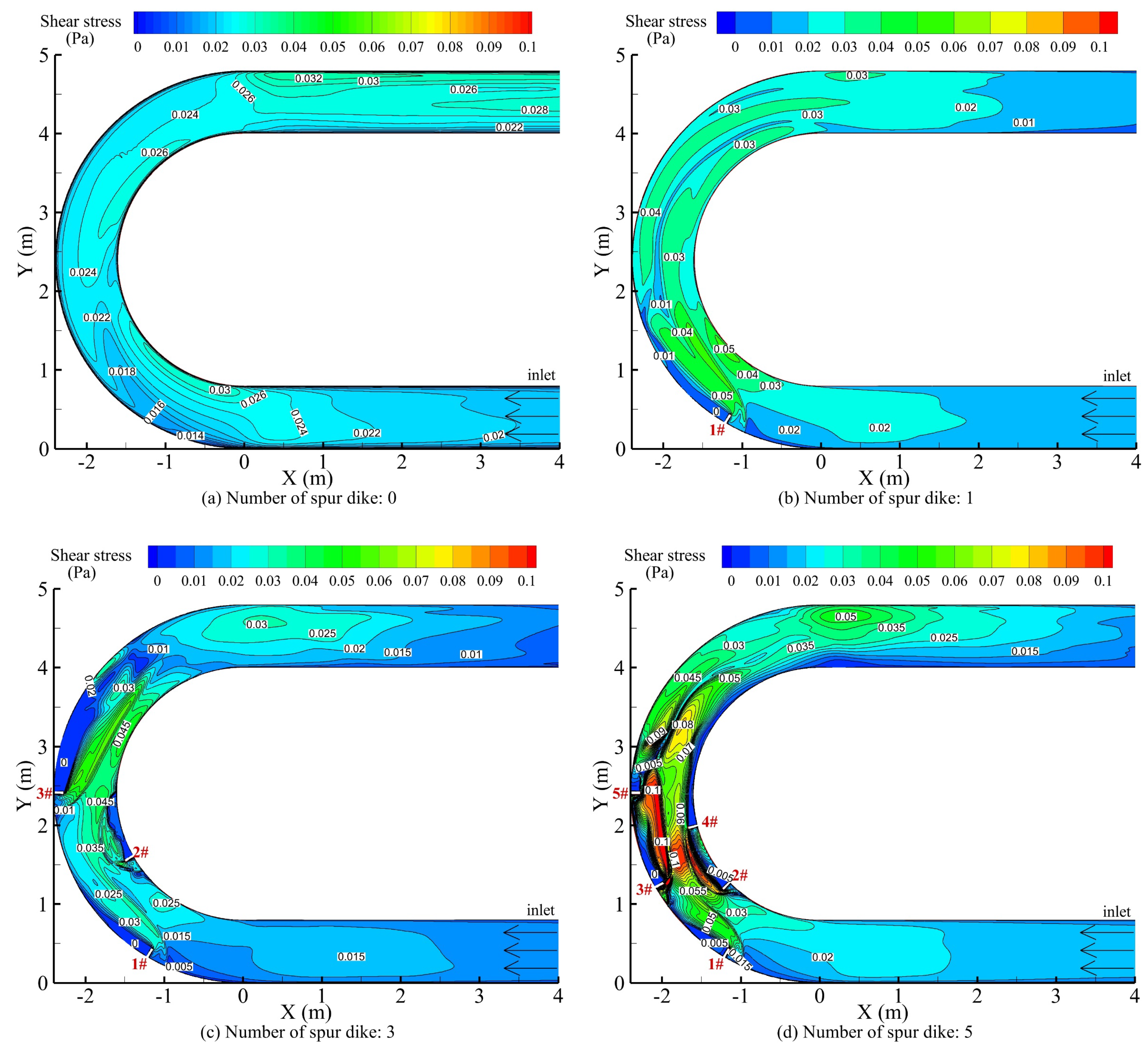 - Moghispour, S.; Kouchakzadeh, S. Spur dike layouts impact on upstream flow conditions during flood wave movement. J. Hydro-Environ. Res. 2024, 53, 44–57. [Google Scholar] [CrossRef]
