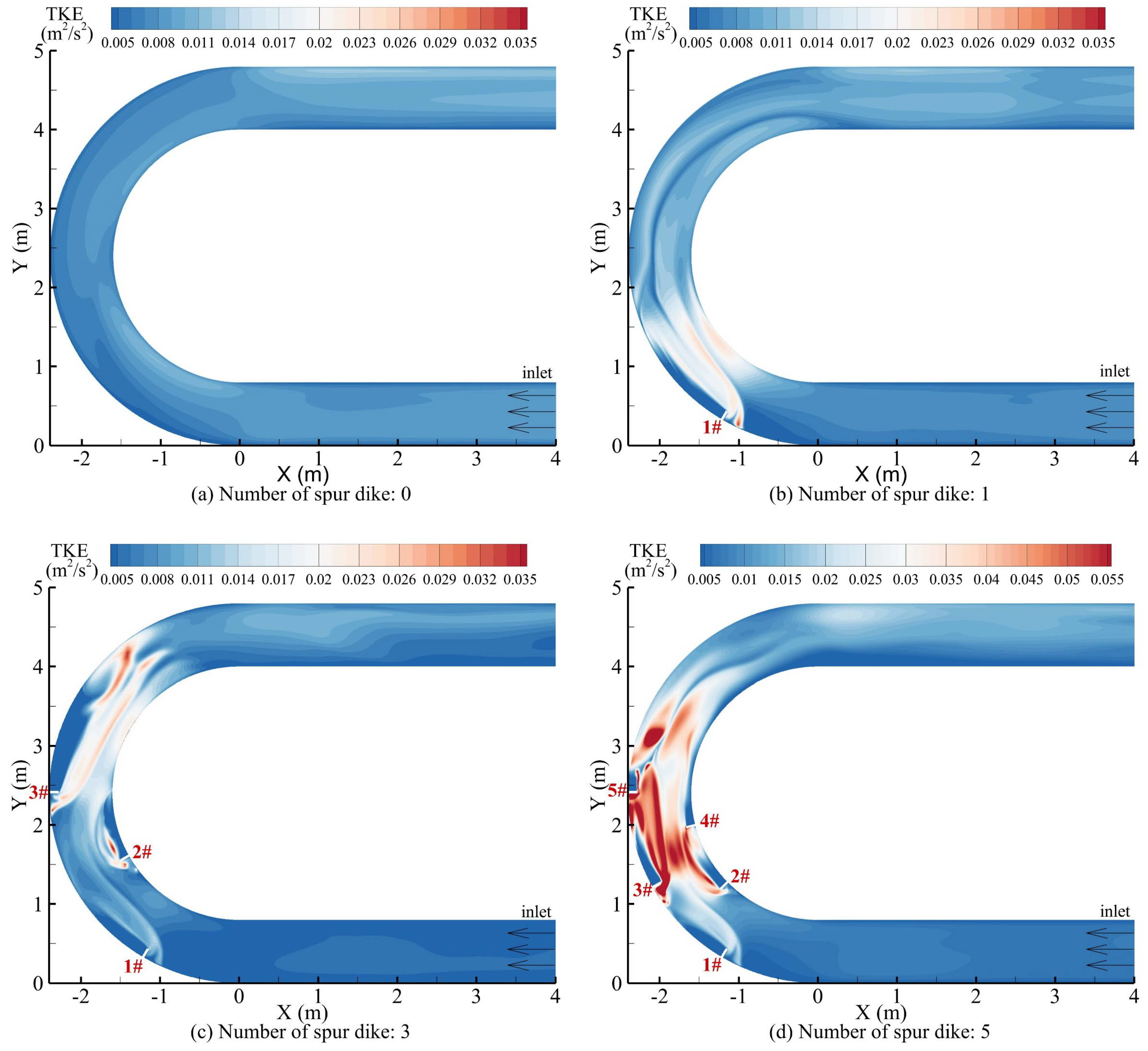 - Xie, P.; Li, C.C.; Lv, S.J.; Zhang, F.Z.; Jing, H.F.; Li, X.G.; Liu, D.D. Numerical simulation of 3D flow structure and turbulence characteristics near permeable spur dike in channels with varying sinuosities. Sustainability 2023, 15, 15862. [Google Scholar] [CrossRef]