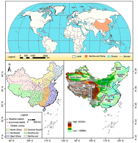 This study uses monthly precipitation records from 683 stations across China for 1951–2018, obtained from the China Meteorological Data Service Center (http://data.cma.cn/). To ensure data quality, we first screened each station series for completeness and removed stations with more than nine years of cumulative missing data. For the remaining stations, we infilled sporadic gaps by regression using nearby stations. We then performed consistency and logic checks, including trend consistency among stations within the same climate-type region and coherent variability among neighboring station groups. After quality control, 64 stations were excluded, leaving 619 stations (see Figure 1). The retained series show good temporal consistency and are representative of precipitation conditions in the study area. Monthly near-surface meteorological variables from the same source include AP, WS, and RH, all observed synchronously at the 619 stations. SR was obtained from the same portal.