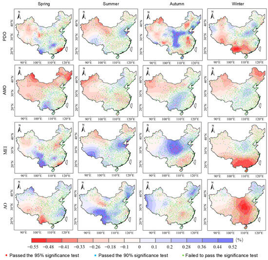Building on the spatial patterns of seasonal means, variability, and shifts, we further assess qualitative links between major ocean–atmosphere indices and seasonal precipitation (Figure 4). Overall, the PDO signal is clear, with seasonal dependence strongest in autumn, then winter, summer, and weakest in spring. In spring, precipitation is significantly positively correlated with the PDO south of the Yunnan–Guizhou Plateau and along the Xuefeng Mountains, significantly negatively correlated in southeastern East China, and mostly insignificant in the Northeast and North China. In summer, correlations are significantly positive along the Bohai coast and significantly negative in the northern part of the Northwest. In autumn, about one third of the country shows significant correlations, with significant positive correlations from the Loess Plateau to the Yunnan–Guizhou Plateau and significant negative correlations in East China, central North China, and the Junggar Basin. In winter, correlations are significantly negative south of the middle to upper Yangtze River, and mostly negative but not significant on the North China Plain. The AMO is dominated by negative correlations, with scattered positives and strong seasonal dependence. In spring, correlations are strongest, significantly positive south of the Yunnan–Guizhou Plateau and significantly negative across the Northeast and much of the West. In summer, correlations are significantly negative south of the Tianshan Mountains, in the Southwest, and across the Jiangnan Hills, while elsewhere they are weaker. In autumn, correlations are positive over the Yunnan–Guizhou Plateau and the Sichuan Basin and negative in the Tarim Basin, and overall weaker than in other seasons. In winter, correlations are significantly negative in the Northeast and the northern Northwest, while the North China Plain shows a nonsignificant positive signal. The MEI shows mainly positive correlations in the warm season and mainly negative correlations in winter. In spring, correlations are significantly positive along the Hengduan Mountains and south of the Yunnan–Guizhou Plateau, with isolated significant negatives on the North China Plain and near the Pearl River estuary. In summer, correlations are significantly positive south of the Tibetan Plateau and east of the Taihang Mountains, and are mostly weakly positive but insignificant over the Xiaoxing’an Mountains and east of the Tianshan. In autumn, about half of the stations reach significance, with significant positives across the Yellow River basin and significant negatives south of the middle to lower Yangtze. In winter, significant negative correlations are widespread south of the Yangtze. The AO exhibits the sharpest seasonal contrast, strongest in winter, followed by summer and spring, and weakest in autumn. In spring, correlation strength decreases from the Northeast toward the Southwest, with significant positives over the Xiaoxing’an Mountains, north of the Junggar Basin, and the Jiangnan Hills, and a significant negative in Yunnan. In summer, about 70% of stations correlate positively with the AO, with significant positives in the Northeast and the Southwest and a significant negative confined to central parts of the Northwest. In autumn, correlation strength decreases from the eastern and western flanks toward the center; significant positives occur in the Northeast and the western Tibetan Plateau, and significant negatives appear east of the Xuefeng Mountains. In winter, about half the stations are significant, with correlation strength increasing from the center toward both east and west; significant positives appear in the Northeast and northern North China, and significant negatives over the Loess Plateau and the central Yangtze.