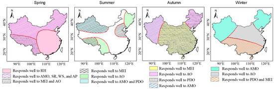 Taken together, the spatial pattern of responses between seasonal precipitation and the drivers is regional. Delineating areas with significant correlations (Figure 6) shows the following. In spring, precipitation correlates well with RH nationwide; it also correlates well with AMO, SR, WS, and AP in the Northeast, North China, the Northwest, and the central–western Southwest, and MEI and AO also influence the central–western Southwest. In summer, precipitation–driver relationships are weak in northern North China, the southern part of South-Central China, East China, and the northern Tibetan Plateau, with correlation coefficients roughly between −0.18 and 0.1; in the northern Northwest, summer precipitation correlates significantly with AMO and PDO; AO affects the Northeast, south of the Tibetan Plateau, the Hengduan Mountains, and the Yunnan–Guizhou Plateau; MEI correlates significantly with precipitation on the North China Plain, in the northern Northwest, and south of the Tibetan Plateau. In autumn, precipitation in the Northeast and northern North China responds well to PDO and AO; correlations with AMO and AO are significant in western Xinjiang and western Tibet; and central and southern China respond well to MEI, PDO, and AMO. In winter, precipitation correlates well with AMO in the Northeast, northern North China, Xinjiang, and western Tibet; AO mainly affects winter precipitation in central and southern China; and PDO and MEI are also influential in the eastern Southwest, the southern part of South-Central China, and southeastern East China.