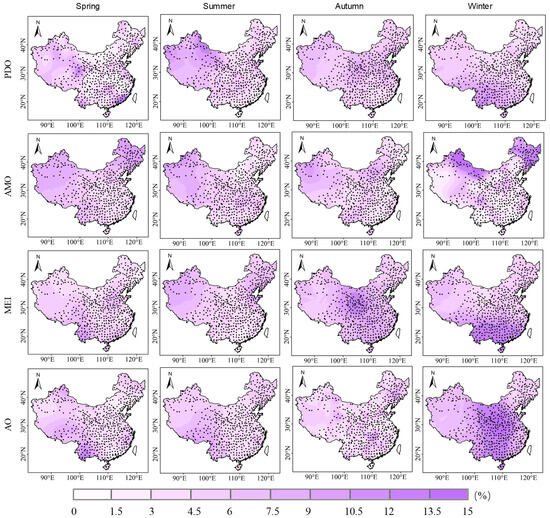 Based on the above procedures, we derive the spatial distribution of contribution rates for each driver to precipitation over China (Figure 8 and Figure 9). The PDO contributes most to summer precipitation, followed by autumn and winter, and least in spring. In spring the PDO contribution is fairly uniform with no pronounced hotspot. In summer it increases from the southeast toward the northwest, reaching 9–13.6% in the northwest and about 2.8% along the east coast of East China. In autumn it weakens outward from central China, with an overall drop of about 2.8% points. In winter it decreases from south to north, exceeding 10.5% over and south of the Yunnan–Guizhou Plateau. The AMO shows a north–south contrast with higher contributions in the north. The seasonal ranking is winter, spring, summer, and autumn in the north, and summer, autumn, spring, and winter in the south. In spring the Northeast and the northern Northwest are higher at 7.5–13.5%; in summer the Tianshan Mountains and the middle to lower Yangtze Plain are higher while central North China is lower; in autumn the Tarim Basin, the Inner Mongolia Plateau, and the Yunnan–Guizhou Plateau are higher, and other areas are lower with a uniform distribution; in winter the northern Northwest and the Northeast reach 12–15%, and elsewhere the pattern is dispersed, with about half of stations at 0–3% and the other half at 3–7.5%. The MEI contributes most to autumn precipitation, followed by winter and summer, and least to spring. In spring contributions are higher along the Taihang Mountains, the Hengduan Mountains, and the Yunnan–Guizhou Plateau, and they are lower over the Changbai Mountains and the Sichuan Basin. In summer contributions are about 7.5% in the Tarim Basin, decay eastward to about 3% over the Loess Plateau, and rise again to above 9% north of the Bohai Sea. In autumn contributions increase markedly over central China, reaching about 13.2% south of the Loess Plateau and decreasing toward both the east and west flanks to about 5.1% in the Northeast and along the western margin. In winter contributions exceed 12% south of the Yangtze River and decrease northward to about 3.8% over the western Inner Mongolia Plateau. The AO contributes most in winter, followed by spring, summer, and autumn. In spring contributions decrease toward about 110° E from north of the Tianshan Mountains, the Xiaoxing’an Mountains, south of the Yunnan–Guizhou Plateau, and the Zhejiang–Fujian hills, from about 12.8% south of the Yunnan–Guizhou Plateau to about 1.2% near 110° E. In summer contributions are relatively high on the Northeast Plain and west of the Hengduan Mountains, exceeding those over the Loess Plateau and regions to its south. In autumn contributions exceed 8.1% in the southern Northeast Plain, the Xuefeng Mountains, the Loess Plateau, and the Qilian Mountains, and are below 4.5% elsewhere. In winter a high-contribution belt lies near 102–112° E at about 14.7% and weakens toward both the east and west.
