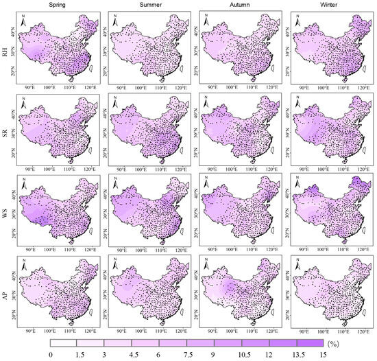 The spatial distribution of the contribution rates of RH, SR, WS, and AP to seasonal precipitation.