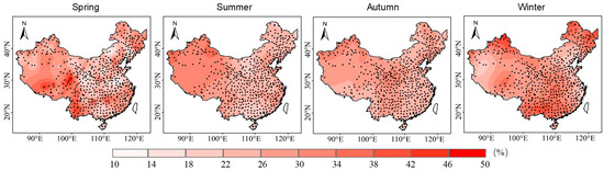 Seasonal precipitation in China exhibits a coherent spatial pattern (Figure 2). The multi-year mean decreases stepwise from the southeast coast toward the northwest interior (Figure 2a). Summer precipitation is greatest; along the southern coast, seasonal totals can exceed 900 mm, whereas in the northwest they are mostly below 50 mm. Spring and autumn rank next, and winter is lowest; in winter, precipitation is below 50 mm across most regions except East China and South-Central China.