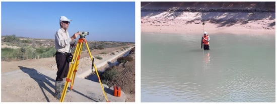 In the first step, a map survey was conducted within reach of the river between Ramshir Dam and Shadegan Wetland. Taking cross-sections of the Jarahi River in this reach, cross-sections of the mentioned branched or turned-out channels, and transferring the height code from sea level to zero points of the water level measurement stations were the things in this section. The WILD NA2 leveling mapping camera (Wild Heerbrugg, Heerbrugg, Switzerland), an STS-752R total station (China), and a Garmin handheld GPS (Garmin Ltd., Olathe, Kansas, USA) were used to carry out the mapping [33]. The round-trip alignment method transferred the code from the Benchmark (BM) of the National Cartographic Centre (NCC) of Iran [34]. The total station camera was used to transfer flat coordinates in the UTM system [34]. Then, the height and flatness of the base were measured according to the available BM in the area. The height and plane coordinates of 17 mapping stations of the studied area available in the Khuzestan Water and Power Authority (KWPA) sources were used in this operation. Generally, 24 cross-sections were surveyed from the Jarahi River every 10 km to map cross-sections from Ramshir Dam and Shadegan Wetland, where the names of the sections are JA1 to JA24, respectively. Figure 2 shows the data collection activities for the current research. In addition, the sections were taken from 100 to 200 m upstream and downstream of the river’s branching channels. In addition, the cross-sections were measured from the flow path in the Ramshir Dam area to the Shadegan Wetland. The list of channels that were measured in the cross-sections is given in Table 1. Finally, the zero-elevation code of the river water level gauging stations was measured, including the Abu tavij, Gorgor, Shahid Hemmat Dam, and Khorosi stations.