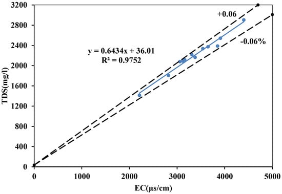 The analysis of TDS and EC (Figure 7) data indicates that the relationship between these two variables is remarkably linear and consistent, such that the trend line TDS = 0.643·EC + 36.01 explains more than 97% of the variations in TDS. Examination of each point’s deviation from the central line shows that the maximum positive deviation is approximately 5.57%, while the maximum negative deviation is around 4.17%, with most points falling within ±3% of the trend line prediction.