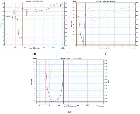 Several examples of Jarahi River cross-sections in the MIKE 11 Model. (a) Cross-section of the Jarahi River at 9.48 km; (b) cross-section of the Jarahi River at 36.71 km; (c) cross-section of the Jarahi River at 147.73 km.