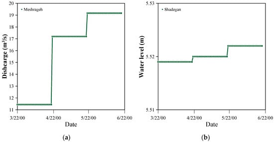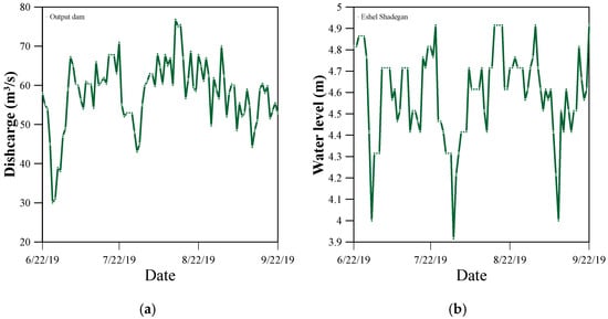 (a) Input boundary condition to the model (output discharge from Ramshir dam from 1 July to 31 September 2019); (b) output boundary condition to the model (Gauge Shadegan, period 1 July to 31 September 2019).