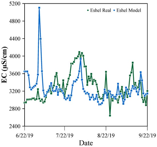 Several key issues were considered regarding the calibration of the model and the clarity of the salinity parameter in the hydrometric stations of the main River. These included considering the salinity for Motbeg drainage as a point source and the salinity in decentralized drains between Gorgor and Hemat Dam station as a distributed source. Such a process was also used in previous research study by Rice et al. [52]. In Figure 12, field-measured data are shown with a blue line, and numerical model results are shown with a red line at Gorgor station. Figure 12 indicates a good correlation between the field data and the numerical model.