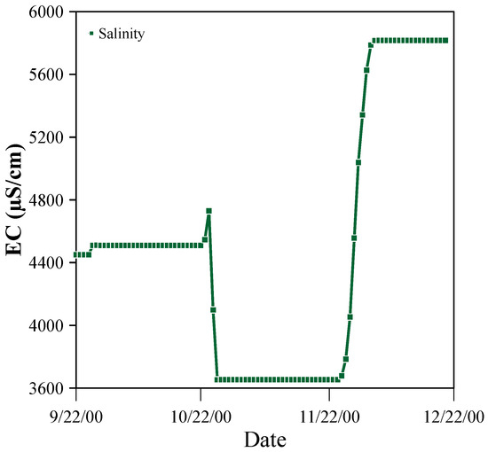 This scenario investigated the salinity of the river in the autumn season. To this end, all required data, including the upstream and downstream boundary conditions under the average minimum discharges in different months of autumn for Meshrageh station and the minimum average gauge for Shadegan station, were introduced to MIKE 11. The average salinity for the upstream border conditions in October, November, and December was 3580, 2350, and 2990 µS/cm, respectively, according to the measured ECs. Figure 13 shows the changes in salinity over time in the section of Gorgor. According to the salinity diagram, the lowest and highest salinity levels in this station were in November at the rate of 3653 µS/cm and in December at the level of 5817 µS/cm. Also, in October, the average salinity was 4510 µS/cm. In this scenario, the highest salinity was observed when the discharge was minimal.