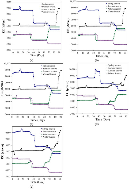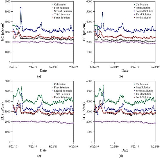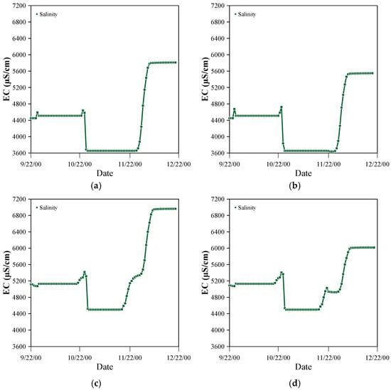 Finally, it can be concluded that the third scenario, which includes the analysis of the salinity of the Jarahi River and the traditional Streams in the summer season under low discharge, has the highest decrease in salinity in the Jarahi River. On the other hand, Figure 24a–d show the salinity level according to the solutions mentioned for the Gahan, Jahangiri, Omal Sakher, and Mansuri streams. In Figure 24a, it can be seen a significant decrease in salinity and its approximate stability in the Gahan stream, according to the third solution, to the extent of 2000 µS/cm over time.