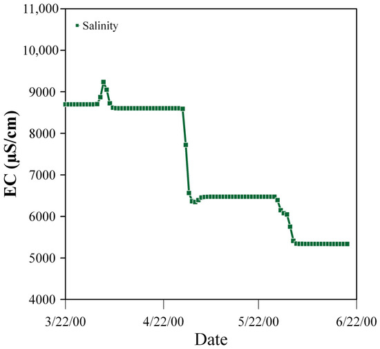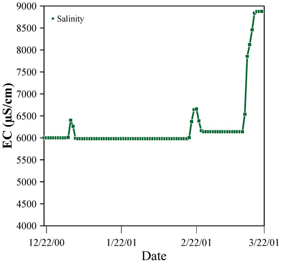 The minimum discharge in this season was investigated considering the minimum discharge at Meshrageh station and the average minimum discharge at Shadegan station. According to the EC value measured in this research, the average salinity for upstream boundary conditions in January, February, and March was added to the model as 3380, 2690, and 3860 µS/cm, respectively. Figure 15 highlights the salinity changes over time in the Gorgor section in the second scenario. In this season, the lowest level of salinity was in January at 5981 µS/cm, and the highest level of salinity was in March at 8877 µS/cm. In February, the average salinity was 6140 µS/cm, showing the highest salinity at the lowest discharge.