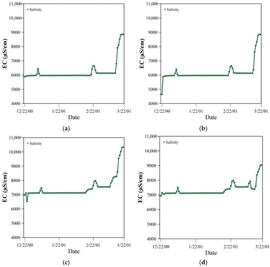 The salinity of the inlet water to the (a) Mansuri stream; (b) Gahan stream; (c) Omal Sakher stream; (d) Jahangiri stream.