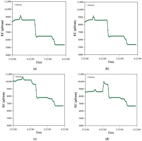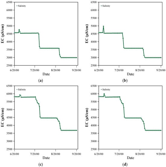 Input salinity to the (a) Gahan stream, (b) Mansuri stream, (c) Jahangiri stream, and (d) Omal Sakher stream, relative to the time in the fourth scenario.