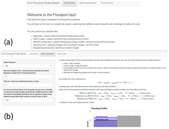 (a) The first tab of the Floodport app (just a part of it, from the beginner-level version), introducing the concepts. (b) the second tab of the Floodport app (just a part of it), allowing the user to select the parameters and showing the results.