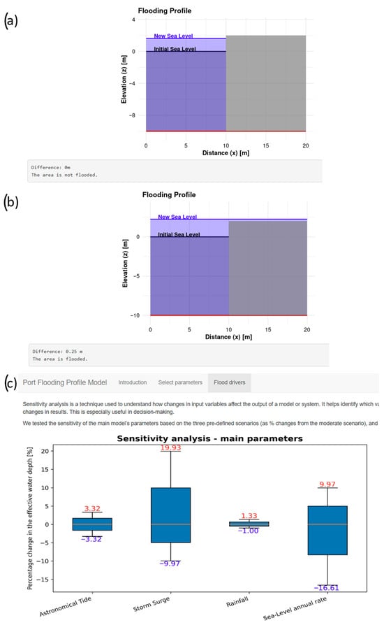 A set of results from the Floodport app (beginner-level version): (a) flooding profile and differences in the moderate scenario (b) and the extreme scenario and (c) the tab with the “main flood drivers”, with the sensitivity visual.