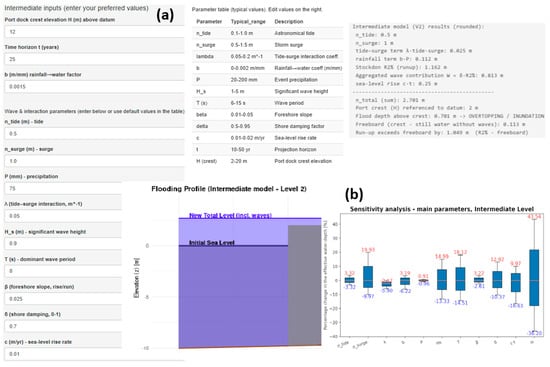 A set of results from the Floodport app (intermediate-level version): (a) flooding profile and differences in a customized scenario (parameter explanation, selection, and result visuals); (b) the tab with the “main flood drivers”, with the sensitivity visual.