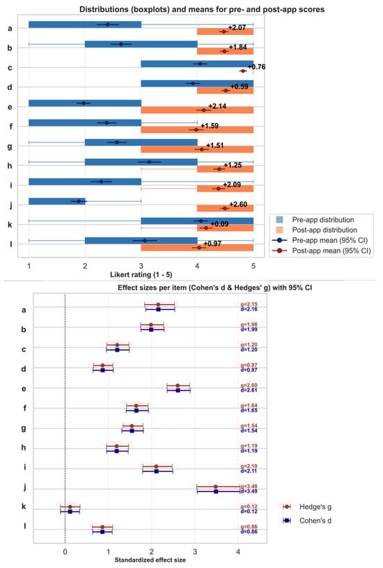 Upper plot: The mean and standard deviation with the distributions of the answers (n = 153) on a 1–5 Likert scale, rating pre-app (blue) and post-app (orange) understanding, shown as paired bar charts with 95% confidence interval (CI) error bars. Lower plot: The difference (change) in understanding scores per question item, as expressed through Cohen’s d and Hedges’ g.