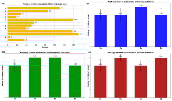 The rest of the questions asked students to rate their agreement, on a 1–5 Likert scale, with statements relevant to the usefulness of the app in learning terms (Q3—question 3), engagement with the topics explored (Q5—question 5), and the practical implications in engineering, decision-making and management (Q6—question 6). The detailed phrasing of the questions can be found in Appendix A, Table A1, questions 3–6. All of the results were near the upper end of the Likert scale, indicating strong perceived gains.