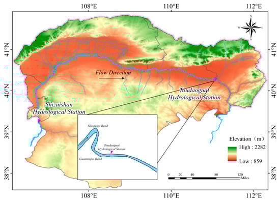 The Toudaoguai reach is located in the lower reaches of the Inner Mongolia section of the Yellow River (as shown in Figure 1). The trend of the river channel changes sharply from the northeast of the upstream to the southeast of the downstream. The river bed slope is about 0.15‰, the average river width is about 300 m, and the average water depth is about 2.85 m [17,18]. The river channel is composed of continuous bends, shoals, mid-shoals and other complex terrains. The Shisifenzi bend is about 4 km away from the downstream Toudaoguai hydrological station [19]. The flow direction is from the upstream northeast to the downstream southwest. The bend is approximately 180° turning, and the bending rate coefficient is 3.15. The river width of the upstream inlet section of the bend is about 620 m. The river channel at the outlet section of the bend is obviously narrowed, with a width of only 215 m and river surface width of nearly 2/3. The Guanniuju bend is 2.5 km downstream of the Shisifen bend. The turning angle of the bend is approximately 60°, and the bending rate coefficient is 1.18, which is significantly smaller than the upstream Shisifen bend. The Guanniuju bend also shows a wide upper and narrow lower shape. The river width at the narrow section of the bend outlet is 168 m, which is only about 1/2 of the width of the upstream river. The Toudaoguai reach is located in a typical continental monsoon climate. In winter and spring, it is affected by the cold air in Mongolia and Siberia. The northerly wind is more, the climate is cold and dry, and the duration is long [20]. The ice flood season in this section generally runs from mid-to-late November to mid-to-late March of the next year. The average flow rate during the ice flood season is 559.48 m3/s. The average ice date for many years (1986–2020) is November 20, and the average freeze-up date is December 11. The average break-up date is March 17 of the next year, and the entire ice period lasts for nearly 4 months. The Toudaoguai reach is a transitional reach connecting the upper and middle reaches of the Yellow River, and it is also a conversion section from plain channel to canyon channel. The ice characteristics of this reach can not only reflect the ice evolution characteristics of the Yellow River (Inner Mongolia reach) in the upper reaches but also directly affect the development of ice conditions in the upper reaches of the Wanjiazhai Reservoir in the lower reaches, which plays a key role in connecting the preceding and the following.