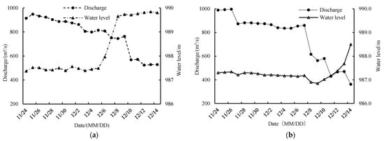 Upstream flow and downstream water level during the flow and stable seal period. (a) 2019–2020; (b) 2020–2021.