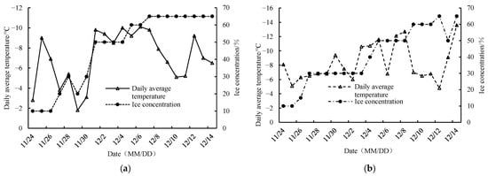 Average daily temperature and ice concentration during the flow and stable seal period. (a) 2019–2020; (b) 2020–2021.