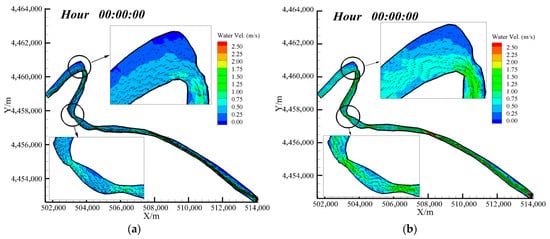 The flow of the day before the ice flow in the winter of 2019–2020 and 2020–2021 is 700 m3/s and 987 m3/s, respectively. According to the flow of the day before the ice flow, the flow and water level at each unit node of the study river section are simulated, and the initial hydraulic conditions before the ice run are obtained as shown in Figure 4. The arrows in the figure represent velocity vectors: their direction indicates the flow direction, and their length corresponds to the magnitude of the velocity. Affected by the topography and flow of the river in different years, the mainstream of the upstream river in 2019 is close to the right bank. Due to the relatively small flow, the maximum flow velocity in the upstream of the bend is less than 1 m/s. At the narrowing of the river surface at the Shisifenzi bend, the flow velocity in the river increases significantly, and the maximum flow velocity increases to 1.25 m/s. The mainstream is gradually biased towards the left bank of the river due to the influence of the bend topography. In 2020, the mainstream of the upstream river channel is in the middle of the river channel, the maximum flow velocity in the river channel is less than 1.2 m/s, and the maximum flow velocity at the narrow part of the Shisifenzi bend is increased by 1.5 m/s. The Guanniuju bend is located 6.22 km away from the upstream, and the width of the river is only 168 m, which has a significant narrowing effect on the flow. The flow velocity is symmetrical on the left and right banks, and the middle flow velocity is the largest. The downstream section of the Guanniuju bend is a straight river channel. Affected by the side bars along both banks, the main current meanders slightly within the channel; owing to the steeper downstream slope, flow velocity in this reach is somewhat higher than in the upstream section. Comparing Figure 4a,b, it can be seen that the overall flow velocity in the river channel in 2019 is less than that in 2020 due to the influence of flow rate.