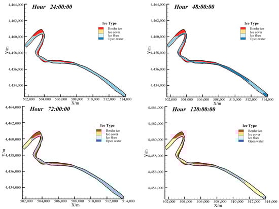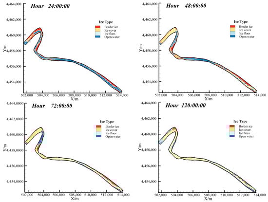 Figure 5 presents the simulated distributions of river ice conditions in the Toudaoguai reach during the freeze-up period of 2019–2020 winter. In the first 24 h of the simulation, the border ice is formed in the area with low flow velocity and shallow water depth. The growth area of the border ice in the upstream of the Shisifenzi bend is larger. Under the influence of the left border ice and the mainstream bias, the surface ice floe is transported along the mainstream to the right bank side. The formation of border ice narrows the river section, weakens the ice transport capacity of the water surface, increases the ice concentration at the bend, and reduces the flow velocity. In the 48 h simulation, as ice continues to arrive from upstream, the ice concentration at the cross-section narrowed by the bend increases further, and the ice jam is formed at the narrow section of the Shisifenzi bend under the synergistic effect of border ice. After ice jamming occurred, the incoming ice from the bend’s upstream accumulated at the jam site to form an ice cover that propagated upstream. Meanwhile, the ice concentration at the constricted section near the exit of the Guanniuju bend rose sharply, creating a potential for a new jam. Both the Shisifenzi and Guanniuju bends retained an open-water reach immediately downstream of their respective jam points. By hour 72 of the simulation, ice jams had formed at both the Shisifenzi and Guanniuju bends. The area of the lead downstream of the Shisifenzi bend shrank, while the lead below the Guanniuju bend vanished as the downstream ice cover advanced, leaving almost the entire downstream channel blanketed by ice. At hour 120, as the freeze-up progressed, all remaining open-water zones within the channel disappeared, and the entire Toudaoguai reach entered duration of ice cover.