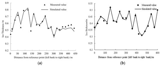 Comparison of simulated ice thickness and measured ice thickness in Shisifenzi bend. (a) 2019–2020; (b) 2020–2021.