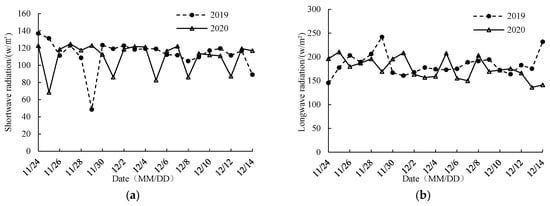Changes in shortwave radiation and longwave radiation in Toudaoguai hydrological station during the ice-stable period in 2019 and 2020. (a) Shortwave radiation; (b) longwave radiation.