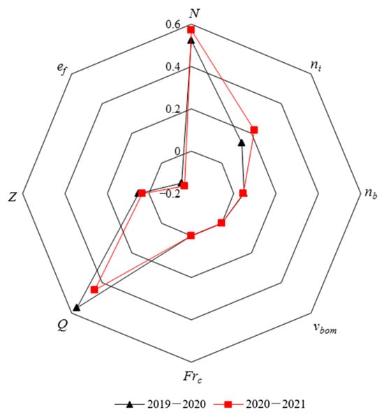 The modified Morris screening method is to keep other parameter values and boundary conditions unchanged and increase a certain parameter by a certain proportion in a single time. By comparing the changes in the backwater water level after ice jam, the sensitivity of the parameter is analyzed. Figure 12 shows the results of the modified Morris screening method for each parameter in 2019–2020 and 2020–2021. It can be seen that the discharge Q and the ice concentration N are the most sensitive to the change in the backwater water level after the ice jam, and the sensitivity is more than 50%. It shows that the upstream flow and the amount of ice in the ice period have the greatest influence on the frozen river in the river channel. The increase of flow not only directly leads to the increase in river water level but also causes the mechanical thickening of the ice-cover. An increase in ice volume raises the likelihood of river channel ice jam formation, which can in turn trigger more severe ice blockages and cause upstream water levels to rise. At the same time, the ice-cover roughness coefficient and the ice porosity are more sensitive coefficients. The sensitivity of the ice-cover roughness coefficient ni in 2020–2021 reaches 22%, which is higher than the sensitivity of the ice cover roughness coefficient ni in 2019–2020. The main reason was that during the winter of 2020–2021, the upstream shore ice in the Shisimazi bend grew so extensively that it severely narrowed the river’s ice-transport cross-section, causing the channel to freeze over; once the ice cover formed, its increased roughness raised flow resistance and pushed upstream water levels higher. The sensitivity of ice porosity is negative, indicating that the larger the porosity of ice accumulation, the lower the water level at the time of river frozen. The riverbed roughness coefficient and the water level Z are low sensitive parameters, and the critical velocity and the critical Froude number do not affect the water level change, which are non-sensitive parameters.